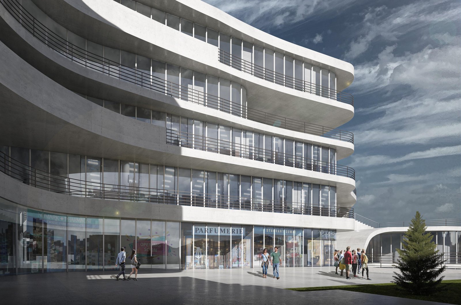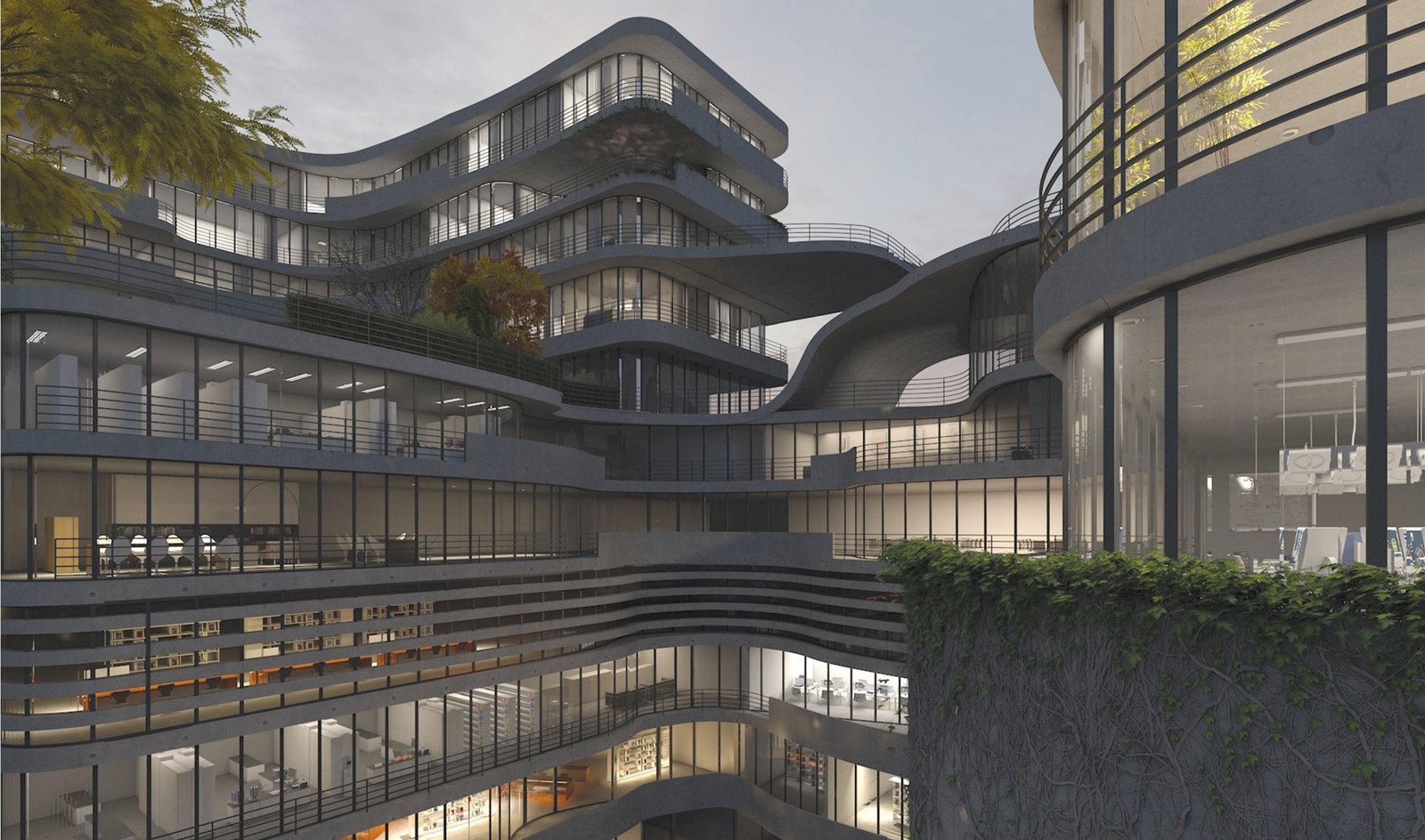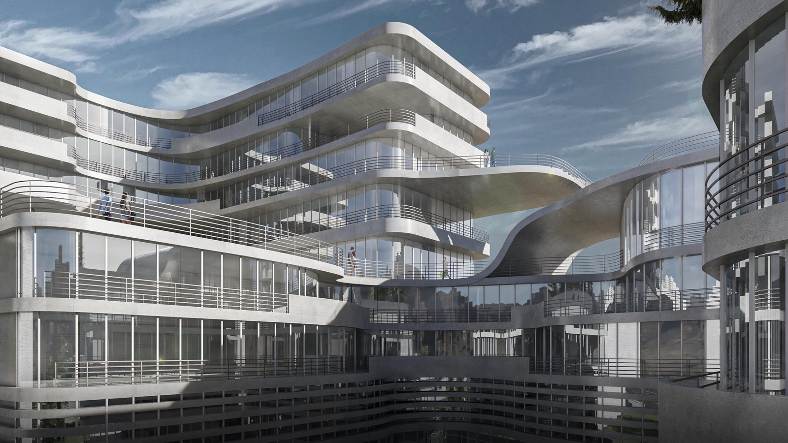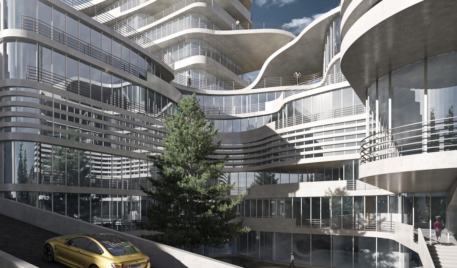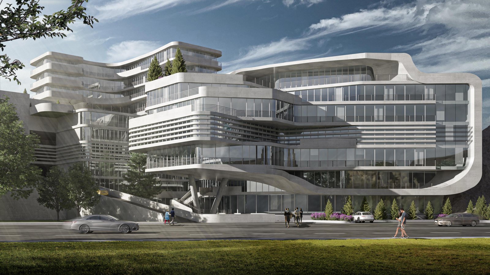 Its dynamic massing, cascading terraces, and fluid concrete lines create a visually unified environment that responds to human scale and urban context.