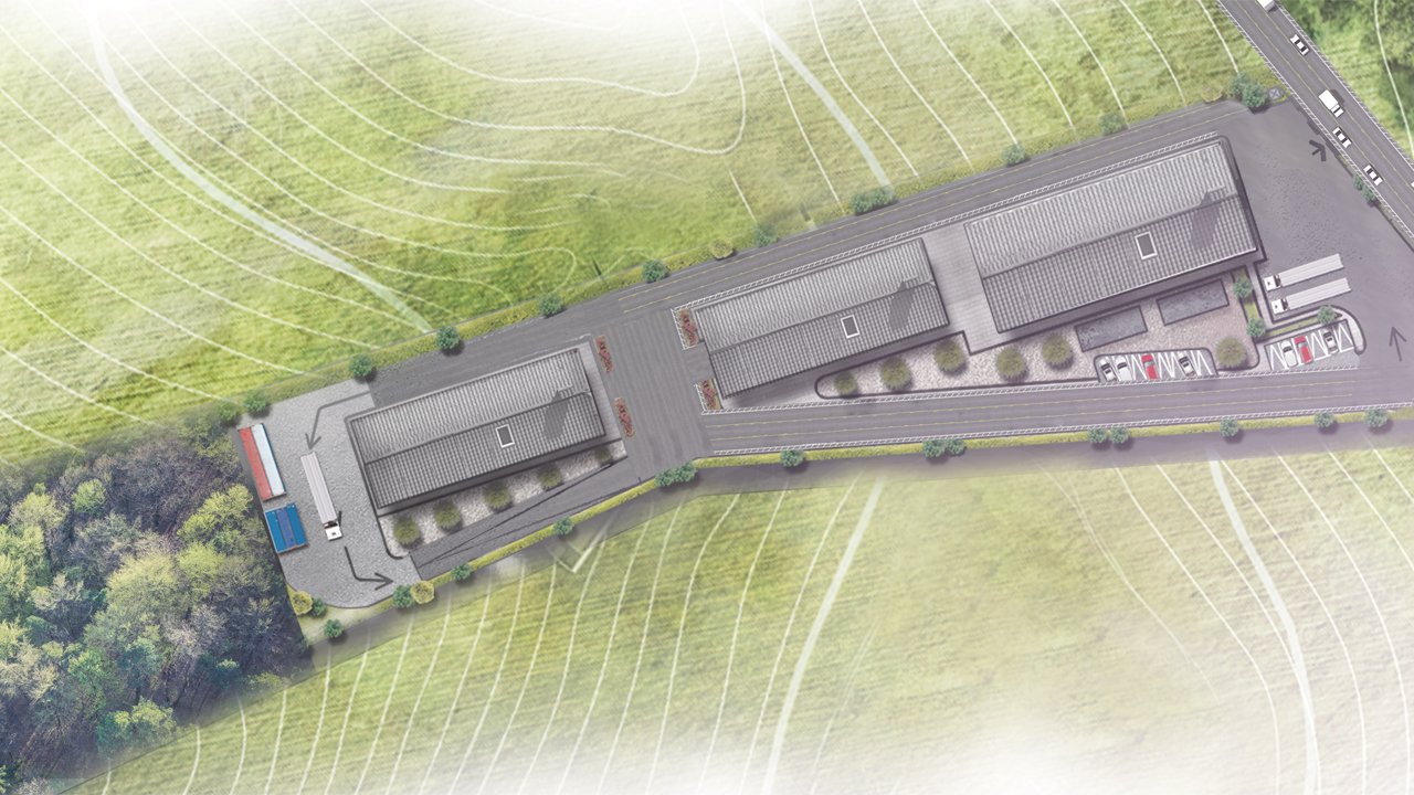 Two main steel structure factories to produce coal from the olive's remnants, and one concrete building for those functions as a storage.